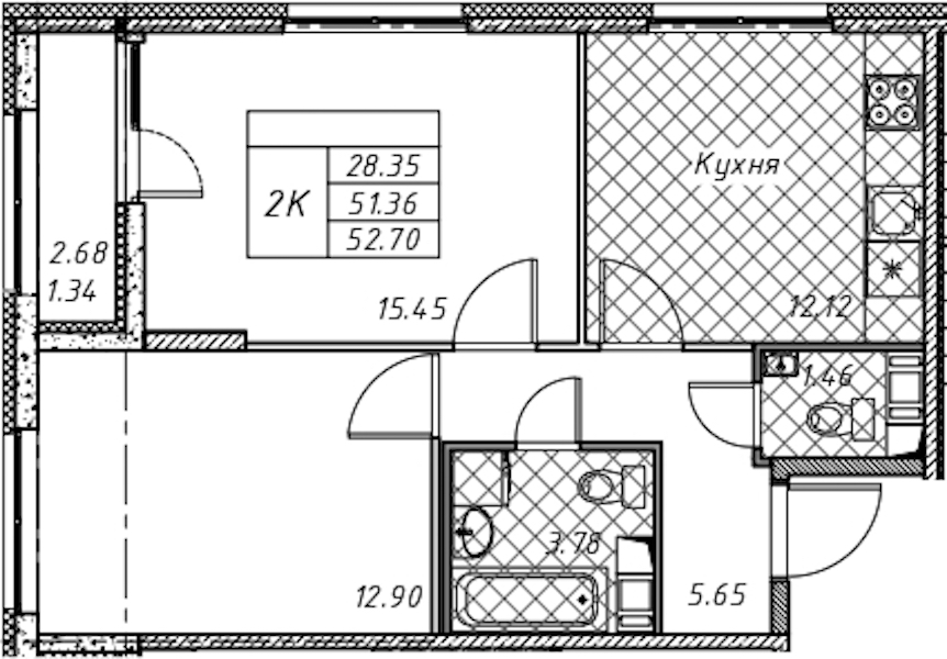 Двухкомнатная квартира на 8-ом этаже 52,7 кв.м