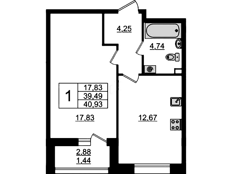 Однокомнатная квартира на 1-ом этаже 40,93 кв.м