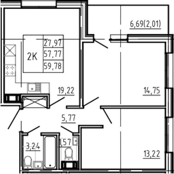 Двухкомнатная квартира на 4-ом этаже 59,78 кв.м