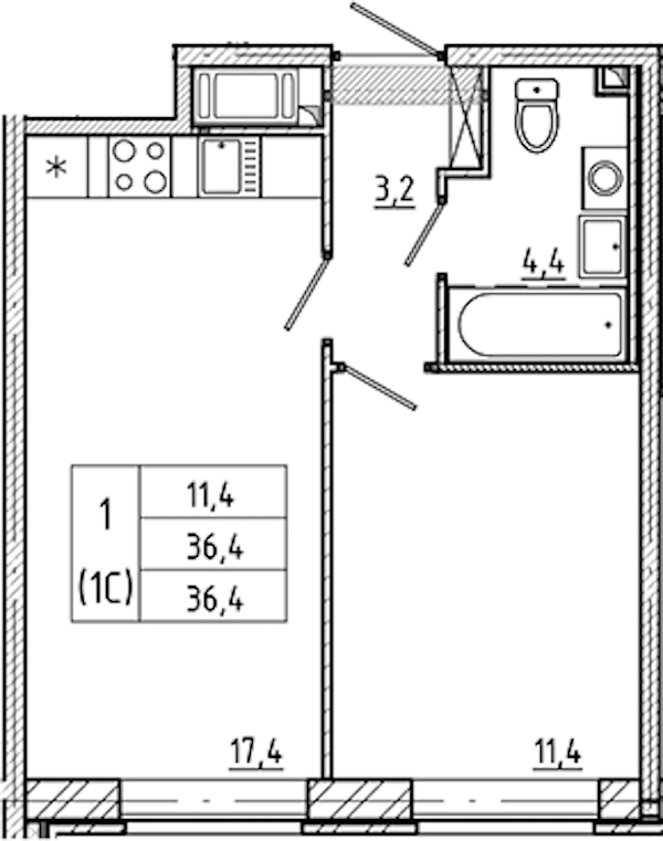 - Площадь36,4 м2