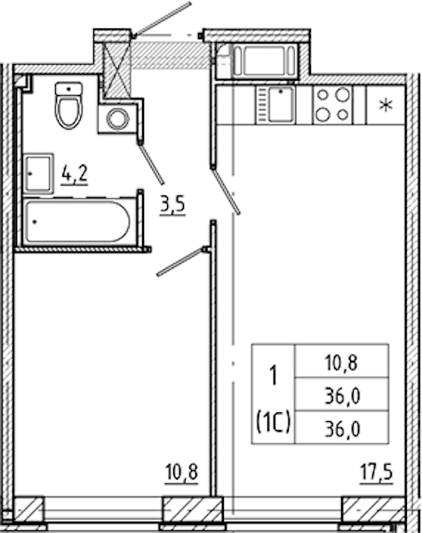 Однокомнатная квартира на 12-ом этаже 36 кв.м