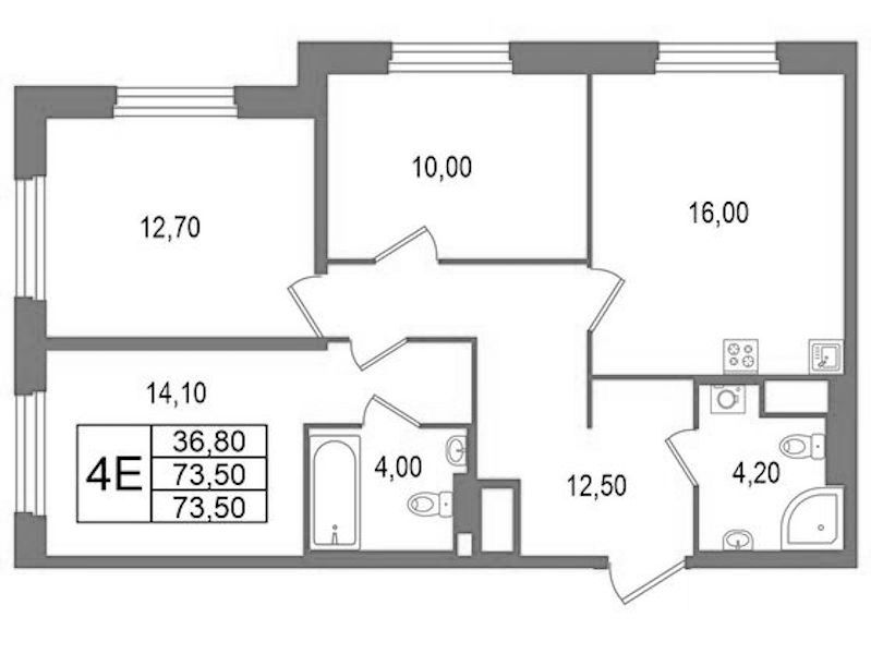 Трёхкомнатная квартира на 4-ом этаже 73,5 кв.м