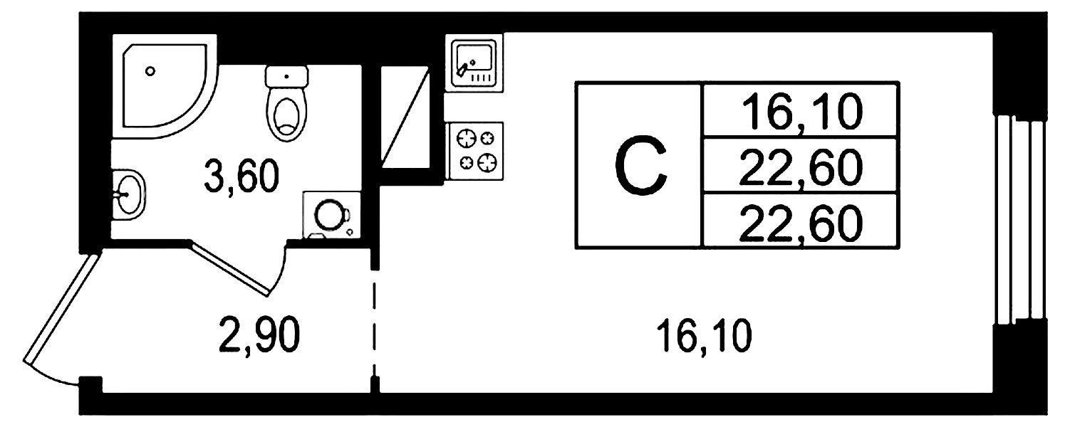 Квартира-студия на 6-ом этаже 22,6 кв.м