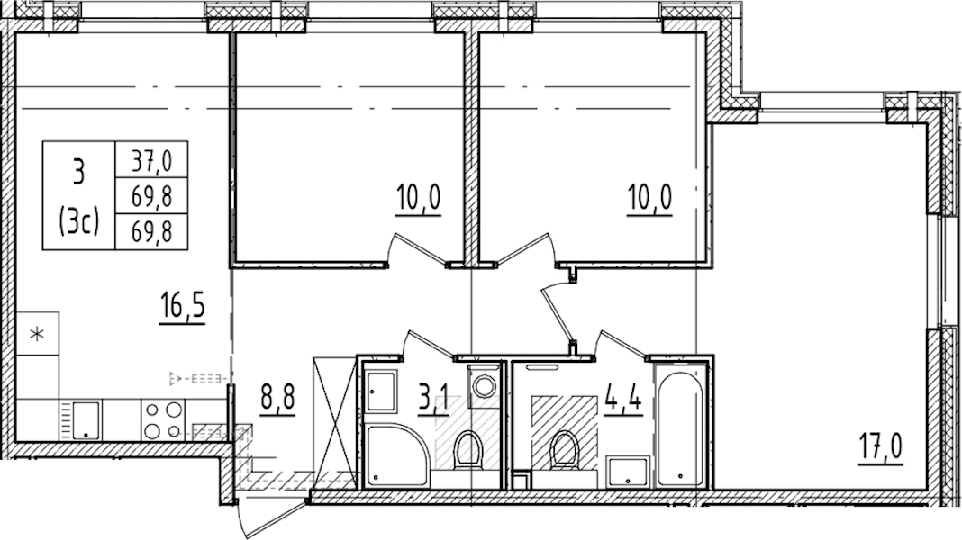 - Площадь69,8 м2