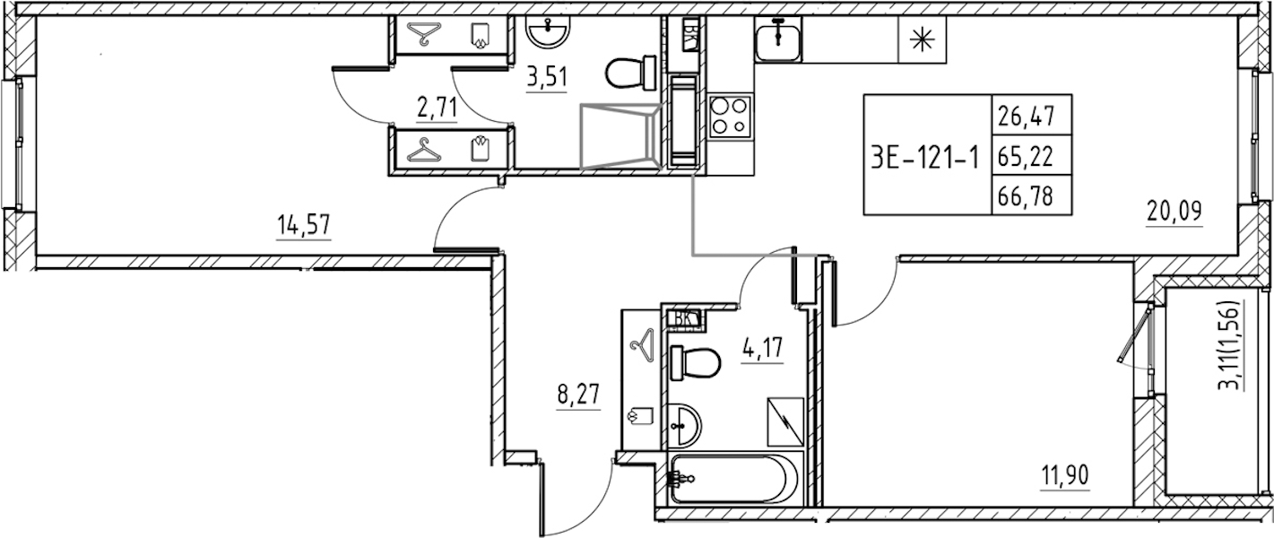 Двухкомнатная квартира на 5-ом этаже 66,78 кв.м