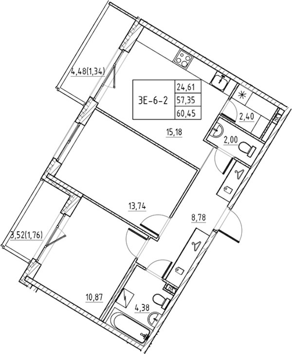 Двухкомнатная квартира на 2-ом этаже 60,45 кв.м