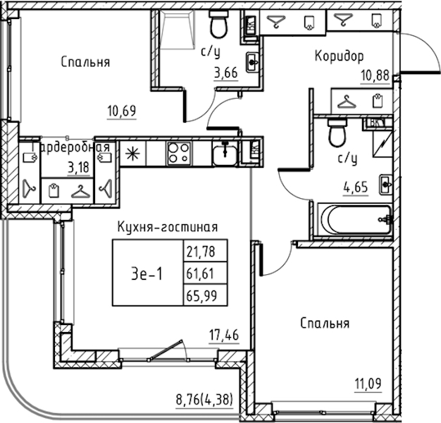 Двухкомнатная квартира на 2-ом этаже 65,99 кв.м
