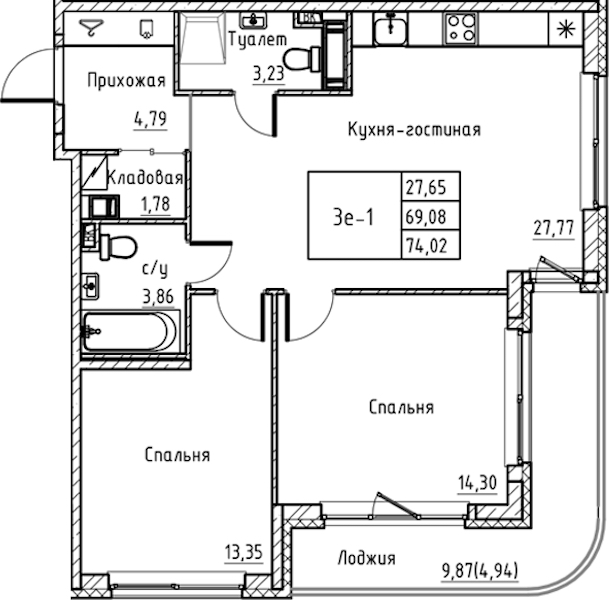 Двухкомнатная квартира на 4-ом этаже 74,02 кв.м