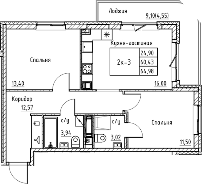 Двухкомнатная квартира на 5-ом этаже 64,98 кв.м