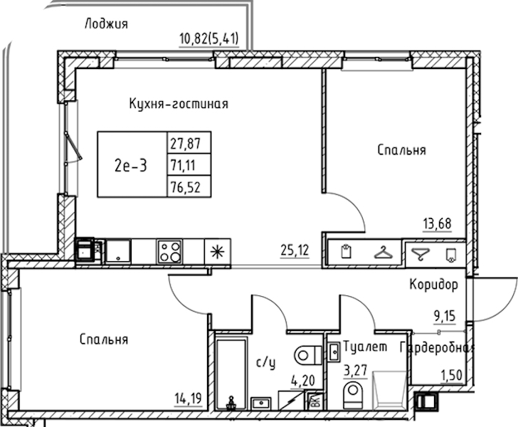 Двухкомнатная квартира на 7-ом этаже 76,52 кв.м