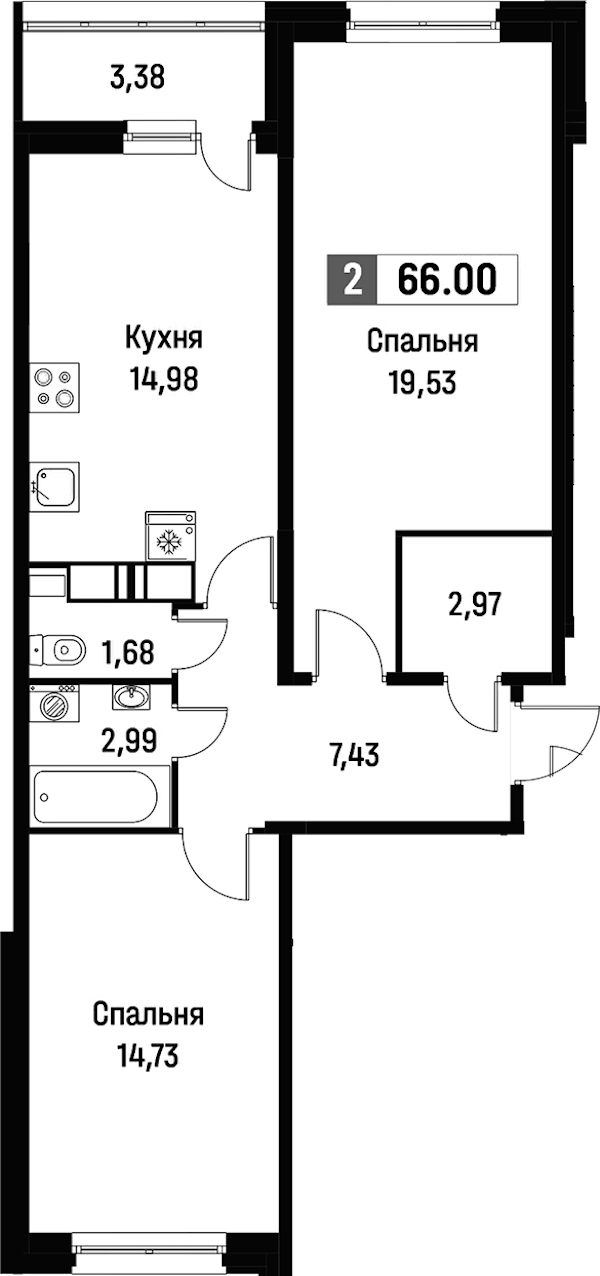 Двухкомнатная квартира на 12-ом этаже 66 кв.м