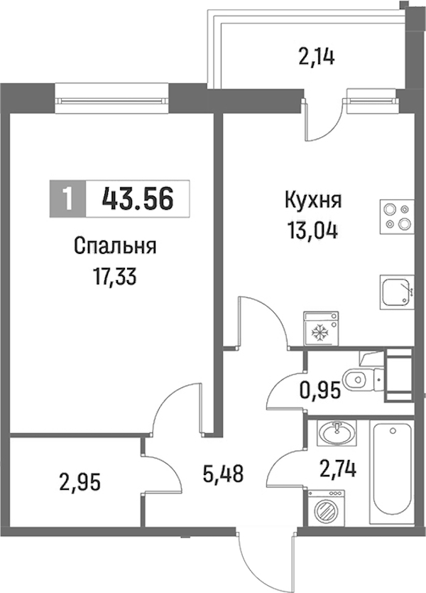 - Площадь43,56 м2