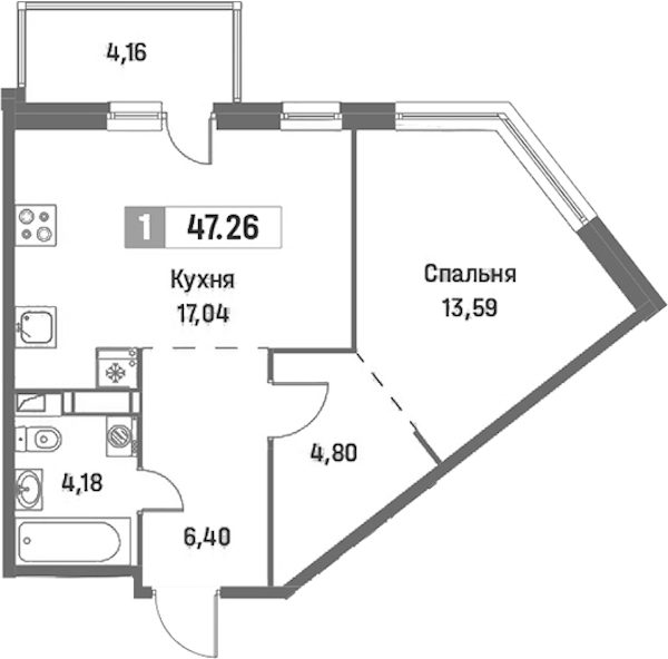 Однокомнатная квартира на 5-ом этаже 47,26 кв.м