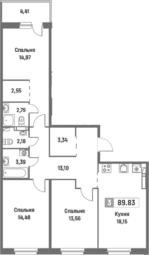 Трёхкомнатная квартира на 4-ом этаже 89,83 кв.м