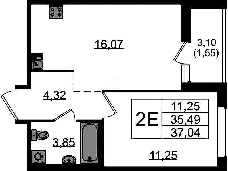 Однокомнатная квартира на 15-ом этаже 37,04 кв.м