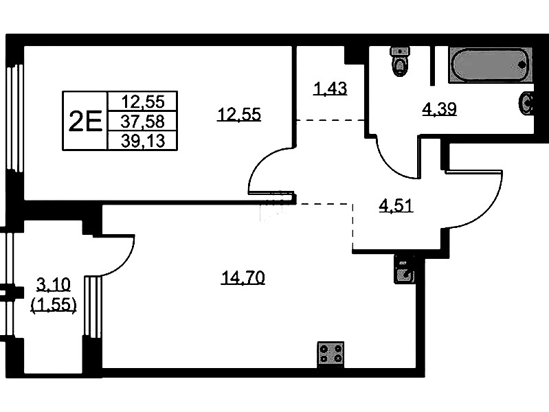 Однокомнатная квартира на 15-ом этаже 39,13 кв.м
