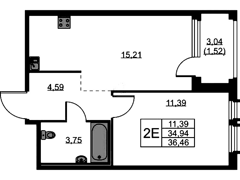 Однокомнатная квартира на 15-ом этаже 36,46 кв.м