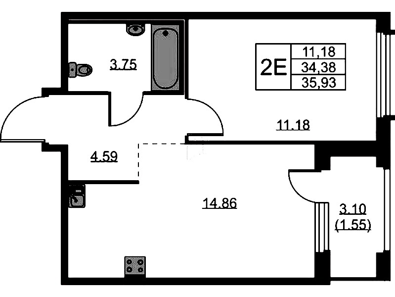 Однокомнатная квартира на 15-ом этаже 35,93 кв.м