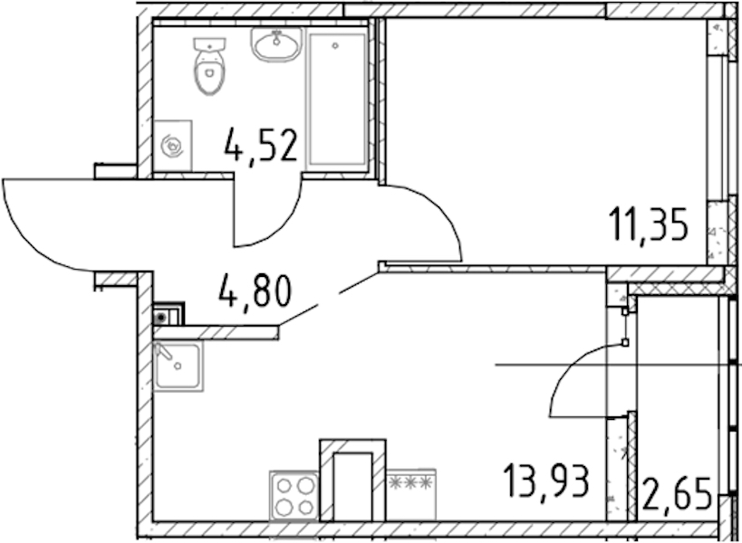 Однокомнатная квартира на 19-ом этаже 34,6 кв.м