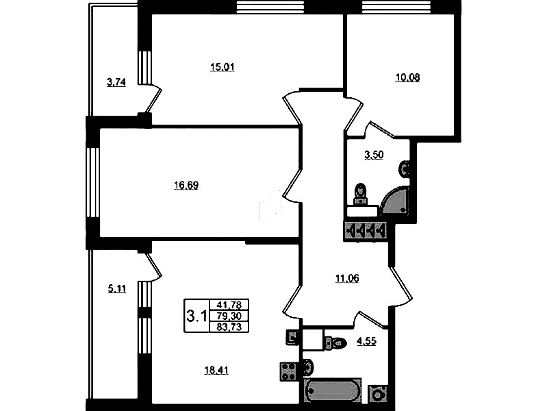 Трёхкомнатная квартира на 2-ом этаже 79,3 кв.м