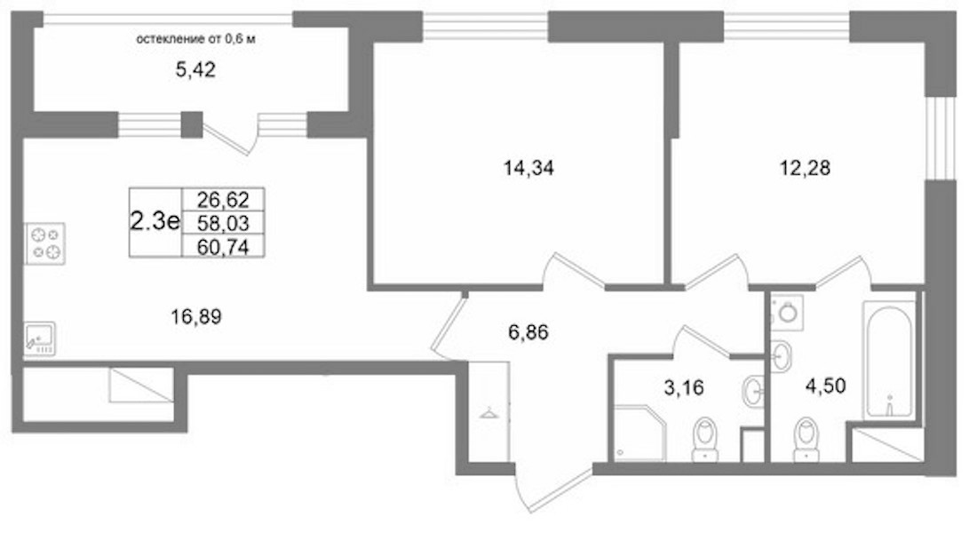 Двухкомнатная квартира на 5-ом этаже 58,03 кв.м