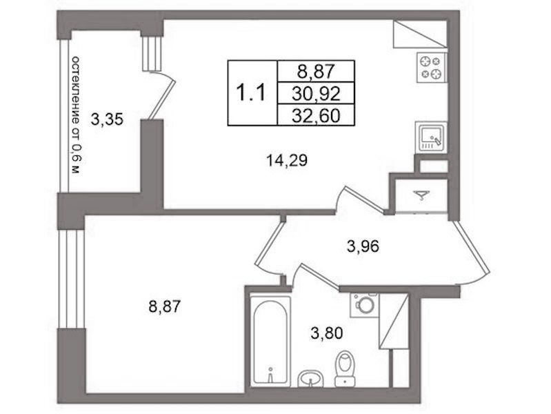 Однокомнатная квартира на 9-ом этаже 30,92 кв.м