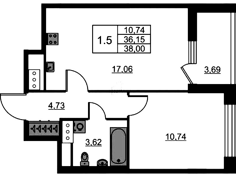 Однокомнатная квартира на 21-ом этаже 36,15 кв.м