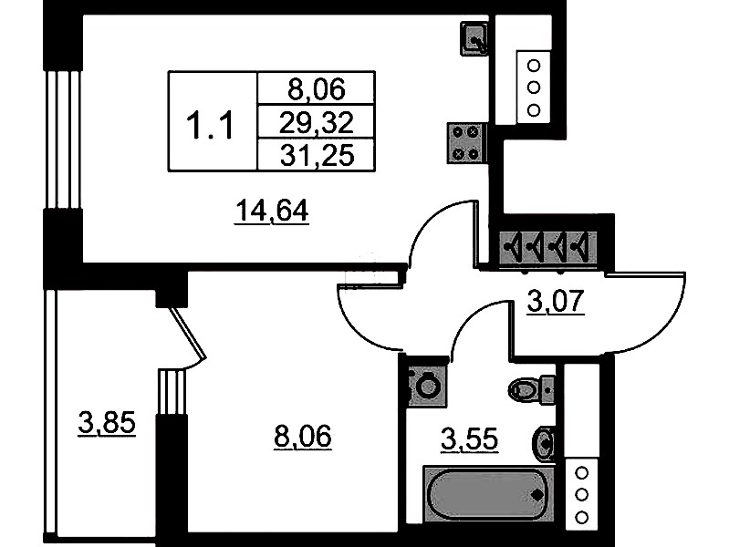 Однокомнатная квартира на 18-ом этаже 29,32 кв.м