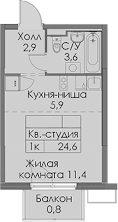 Квартира-студия на 8-ом этаже 24,6 кв.м