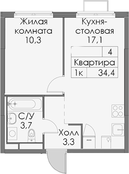 Однокомнатная квартира на 7-ом этаже 34,4 кв.м