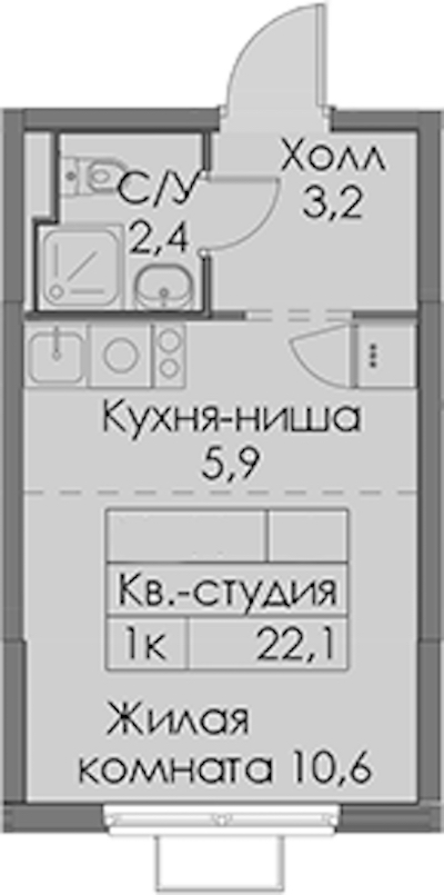Квартира-студия на 8-ом этаже 22,1 кв.м
