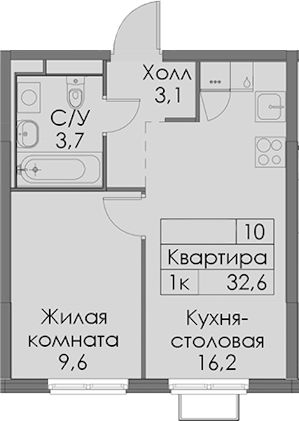 Однокомнатная квартира на 10-ом этаже 32,6 кв.м