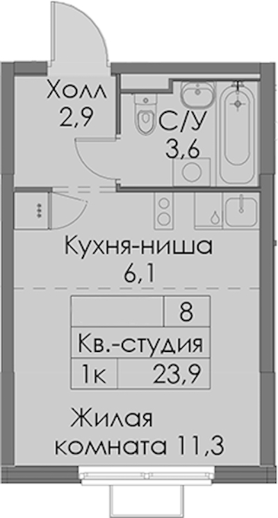 Квартира-студия на 15-ом этаже 23,9 кв.м