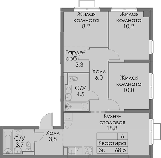 Трёхкомнатная квартира на 6-ом этаже 68,5 кв.м