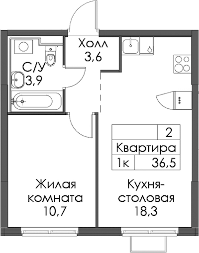 Однокомнатная квартира на 3-ем этаже 36,5 кв.м