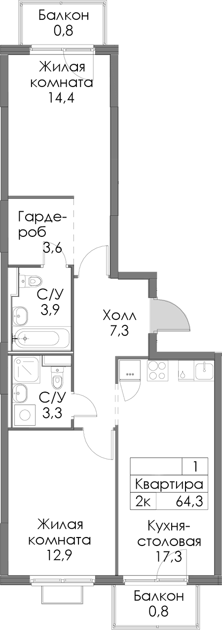 Двухкомнатная квартира на 4-ом этаже 64,3 кв.м