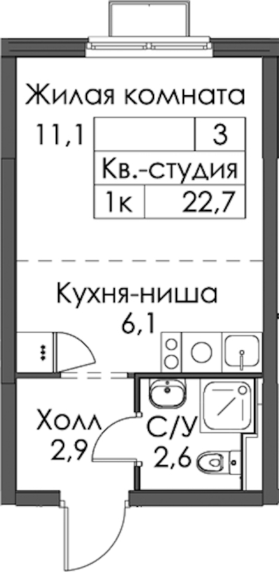 Квартира-студия на 7-ом этаже 22,7 кв.м