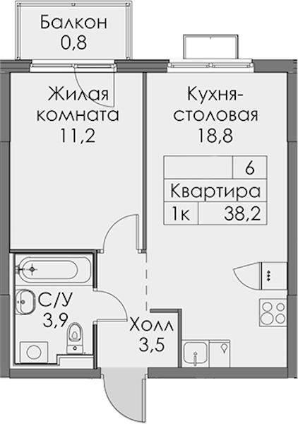 Однокомнатная квартира на 5-ом этаже 38,2 кв.м
