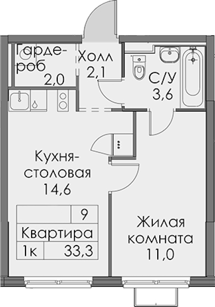 Однокомнатная квартира на 12-ом этаже 33,3 кв.м