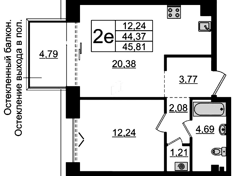 Однокомнатная квартира на 4-ом этаже 44,37 кв.м