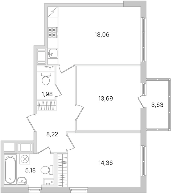 Двухкомнатная квартира на 3-ем этаже 61,49 кв.м