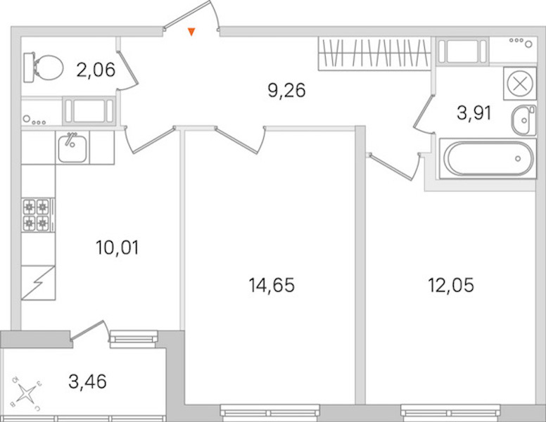 Двухкомнатная квартира на 8-ом этаже 51,94 кв.м