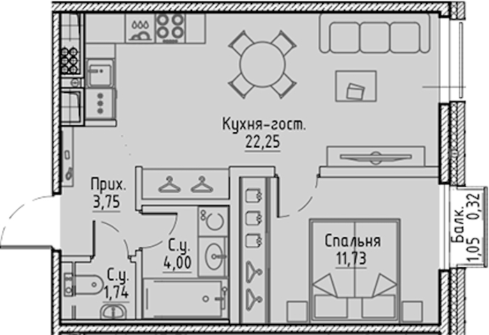 - Площадь кухни22,25 м2