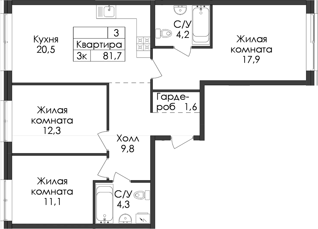 Трёхкомнатная квартира на 1-ом этаже 81,7 кв.м