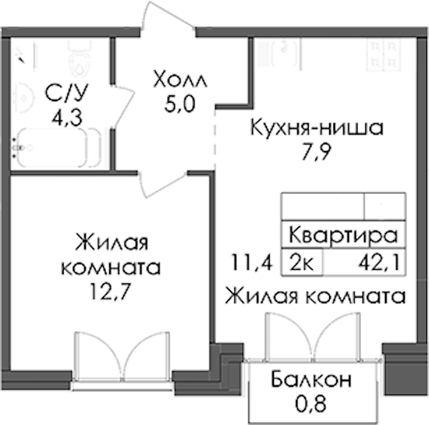 Однокомнатная квартира на 4-ом этаже 42,1 кв.м