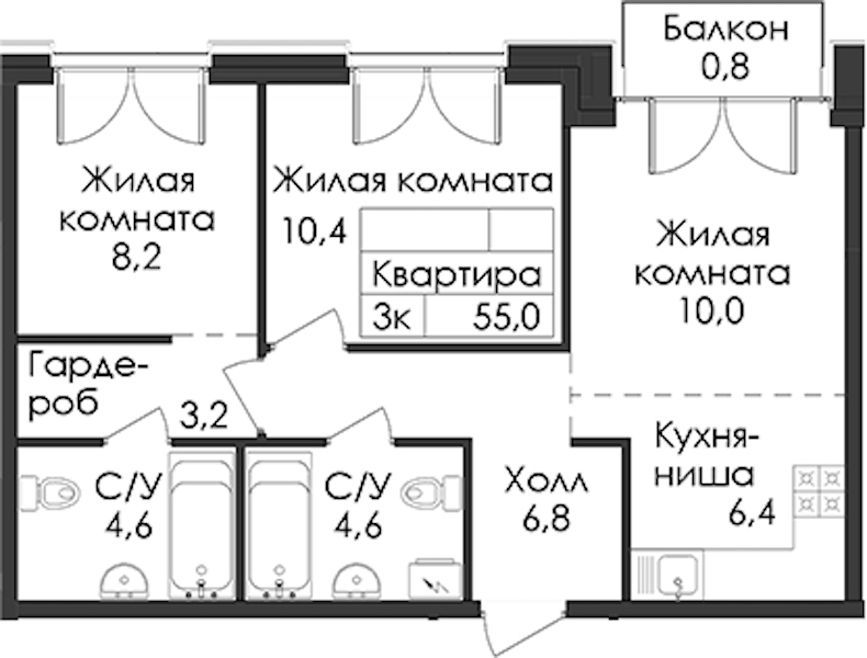 Двухкомнатная квартира на 3-ем этаже 55,1 кв.м