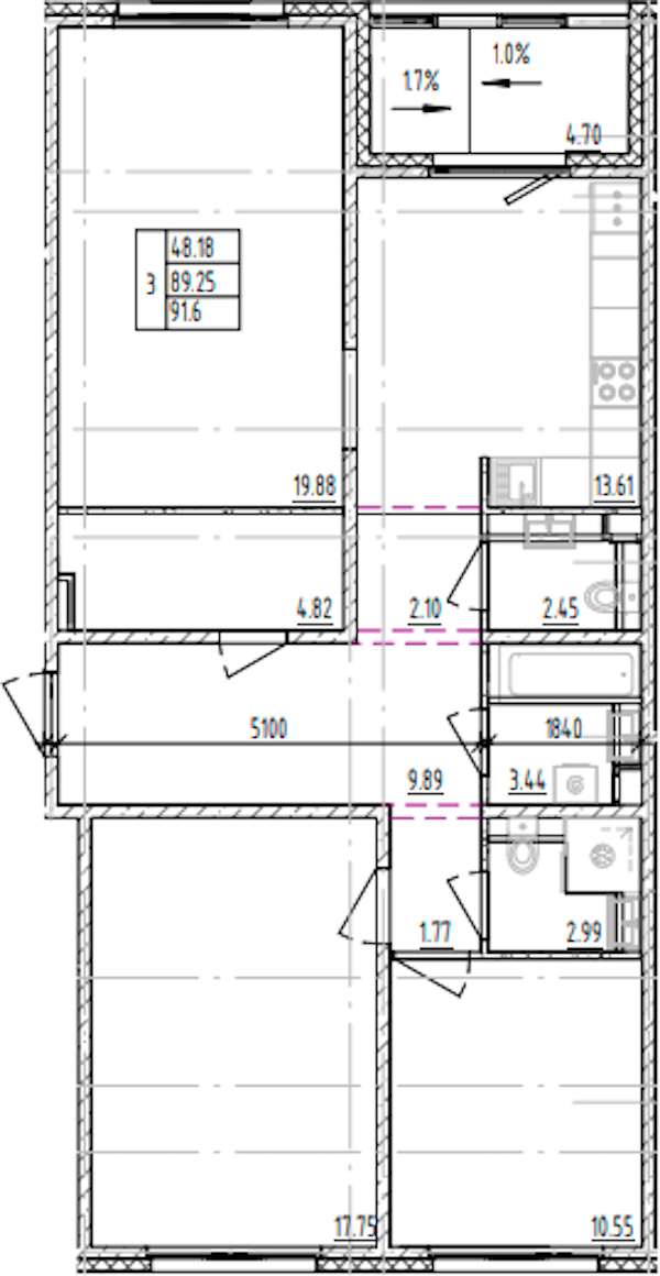 Трёхкомнатная квартира на 6-ом этаже 91,6 кв.м