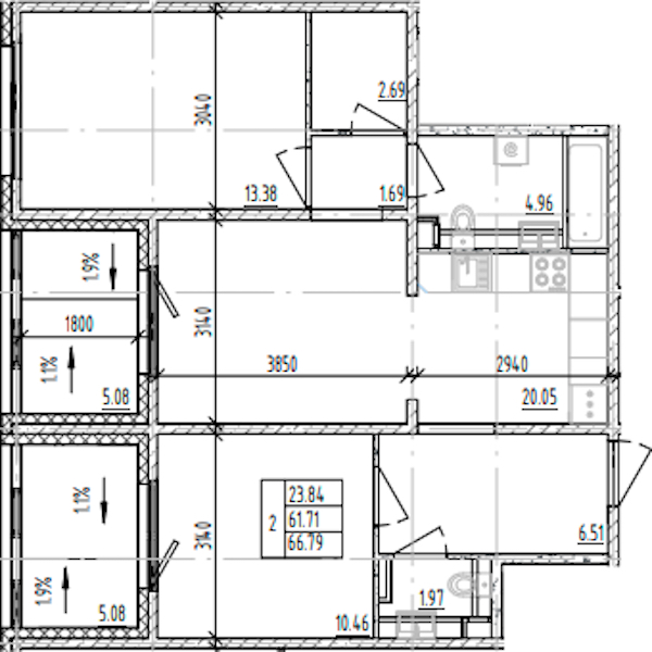 Двухкомнатная квартира на 8-ом этаже 66,79 кв.м