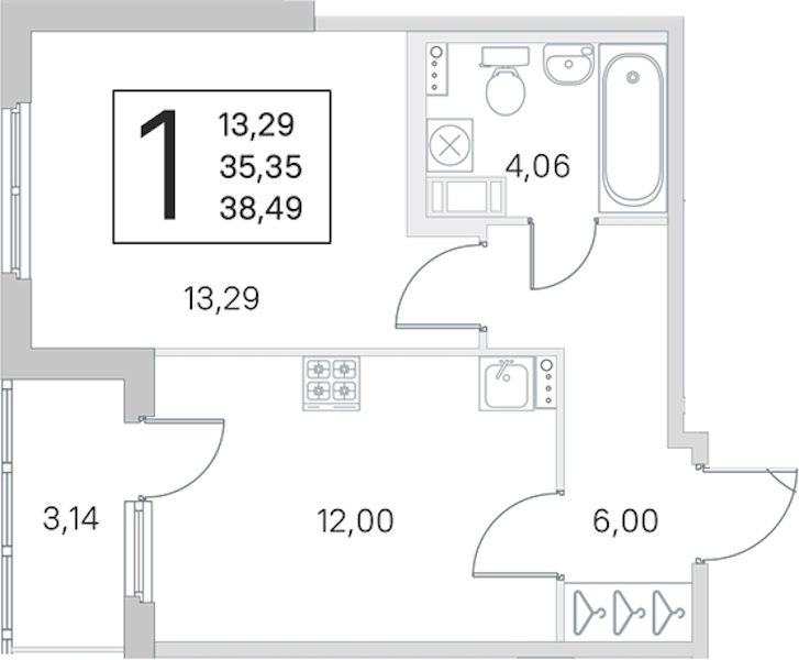Однокомнатная квартира на 2-ом этаже 35,35 кв.м