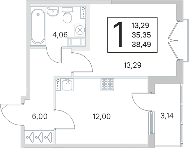 Однокомнатная квартира на 3-ем этаже 35,35 кв.м